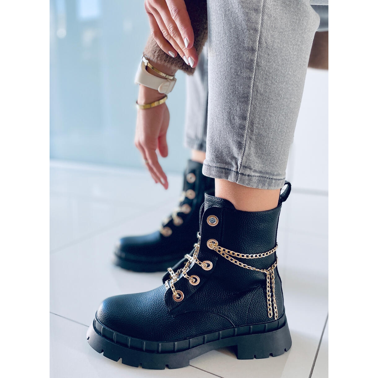 Gležnjače Lohan Black na vezanje nezaobilazan su dio svake ženske garderobe! Ove privlačne crne čizme odlikuju se originalnim dizajnom koji spaja udobnost i modu. Umjesto tradicionalnog vezivanja, ovaj model opremljen je elegantnim zlatnim lančićem koji mu daje jedinstven karakter. Set također uključuje izmjenjive vezice, što vam omogućuje personalizaciju izgleda cipela.