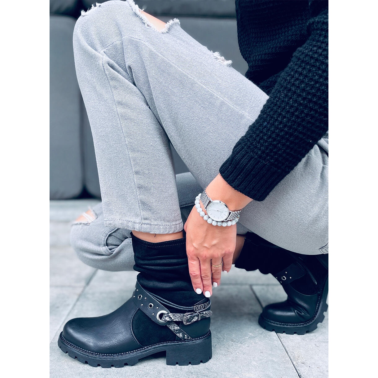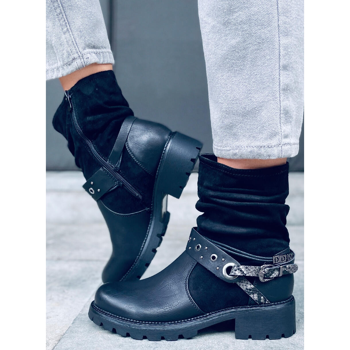 Lorde Black gležnjače sa štitnikom idealan su prijedlog za žene koje cijene stil i udobnost u svakodnevnoj uporabi. Ove elegantne, crne čizme u modernom vojničkom stilu kombiniraju visokokvalitetnu ekološku kožu i ekološki antilop, što ih čini iznimno atraktivnim. Remen s motivom zmijske kože dodaje originalnost i jedinstven karakter, izdvajajući ih od ostalih modela.