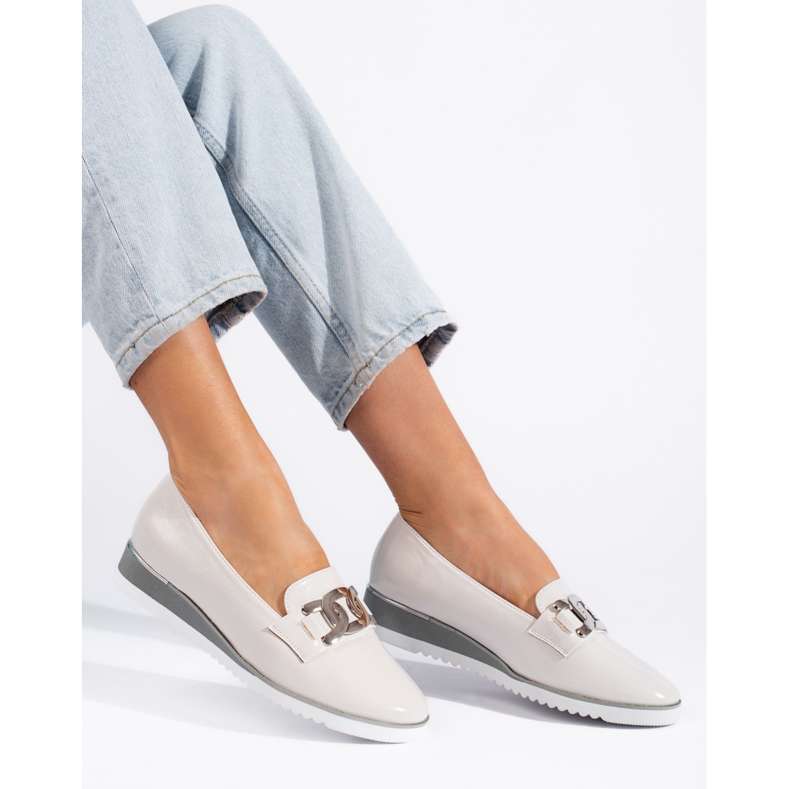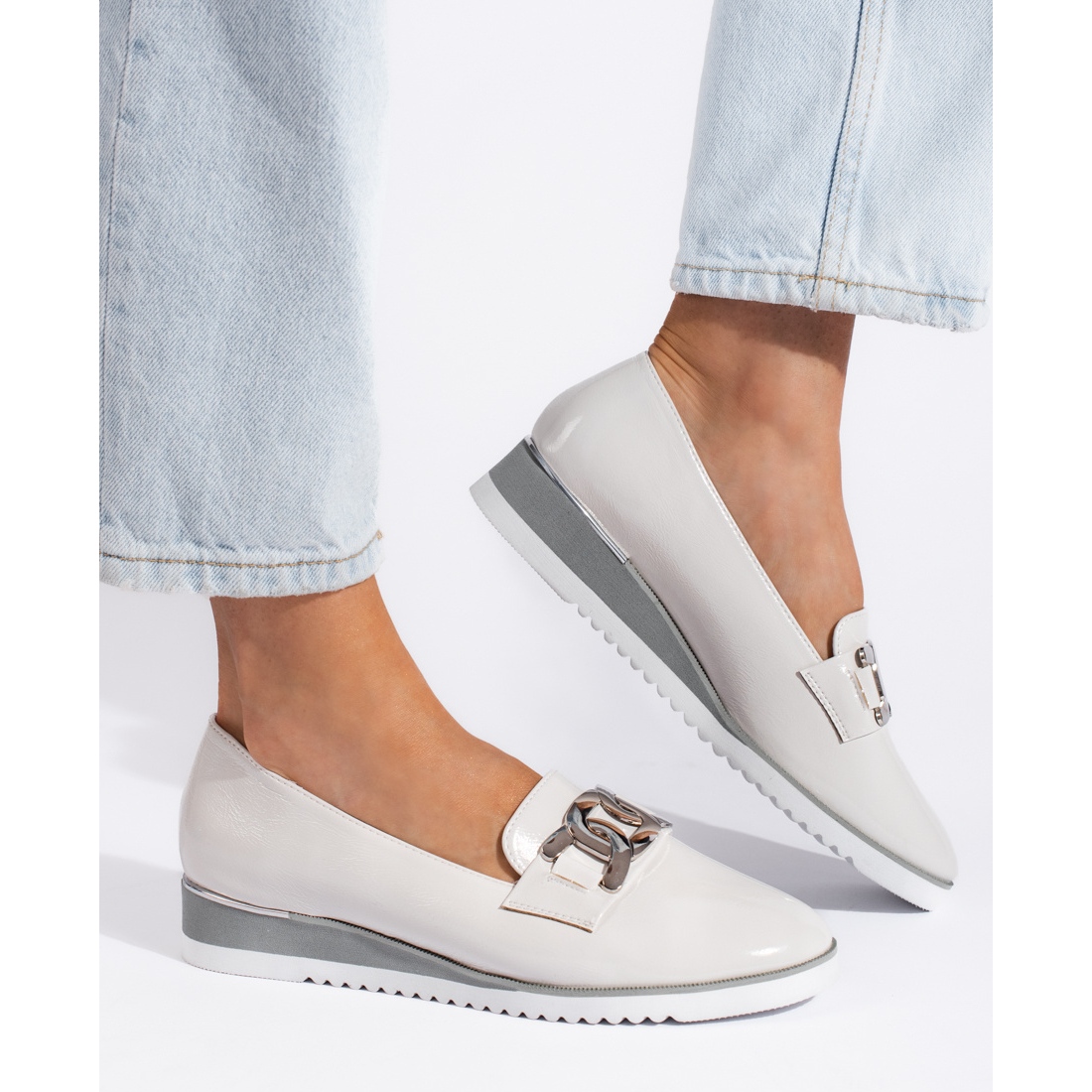 Napravljeni od lakirane ekološke kože, gospodari su karakterizirani ne samo estetikom, već i praktičnošću. Imitacija unutarnje kože i ekološkog kožnog umetanja jamči udobnost, a meka, ugrađena peta dodaje stabilnost. Okrugli nožni prst i plastični potplat s gazimanjem osiguranja odgovarajućeg prianjanja i udobnosti nošenja.