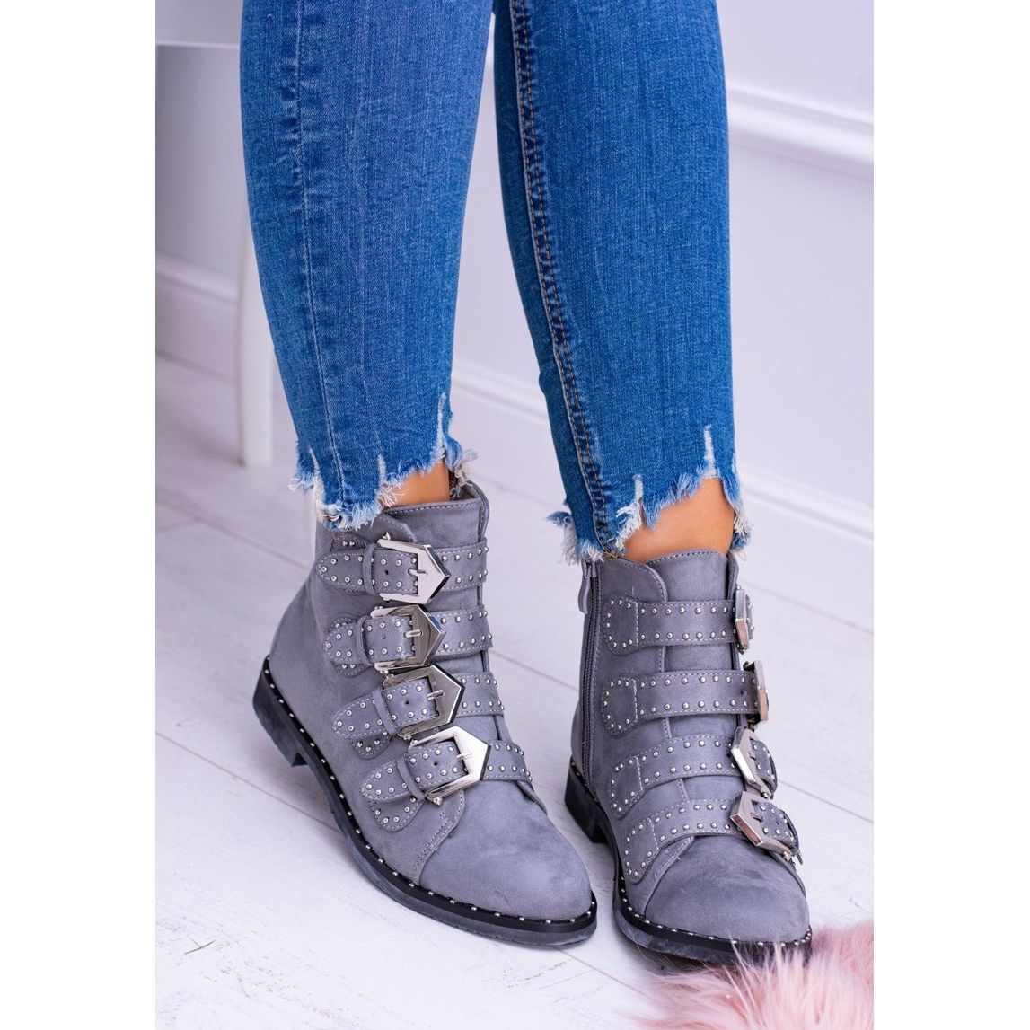 Detalji: Lu Boo Tamno sive čizme Virginia Rock Star zakovice Kopče Suede siva