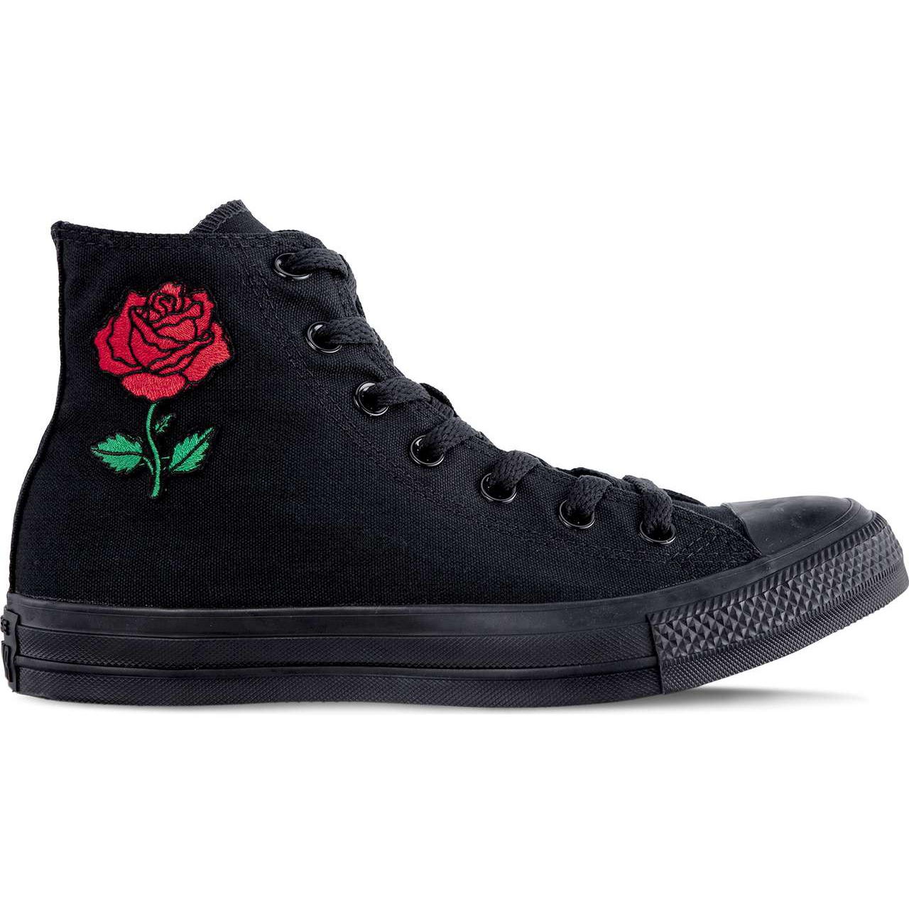 Klasične visoke Converse tenisice u crnoj boji sa suptilnom aplikacijom crvenog ruža na vanjskoj strani. Druga strana je ukrašena ušivenim Converse logom. Izrađene od ugodne tkanine, blago ukrućene u području pete, s karakterističnim okruglim vrhom obloženim gumom i crnim gumenim potplatom s tamnim gazištem - savršen spoj udobnosti i stila.