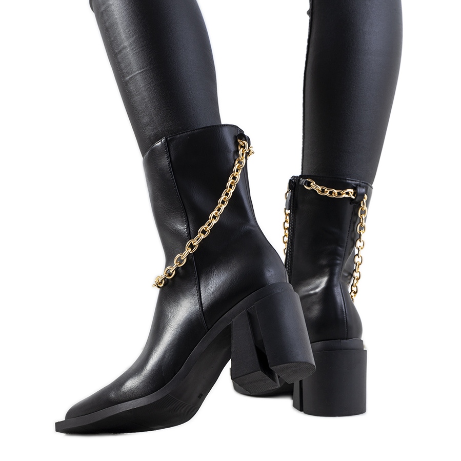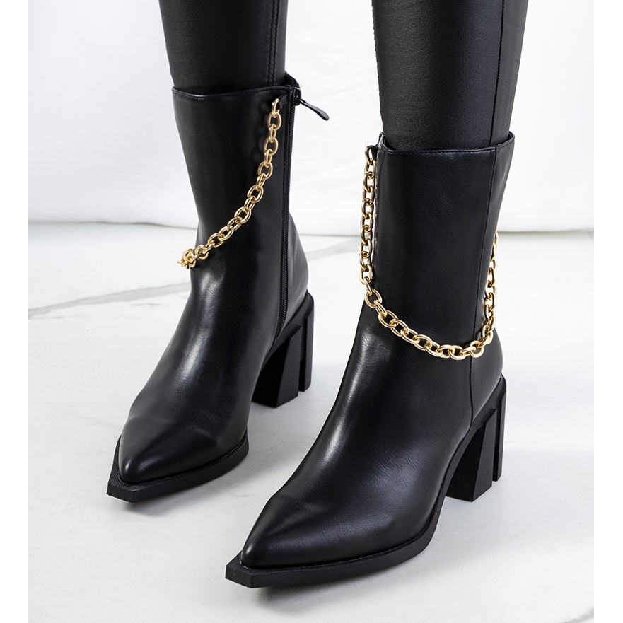 Karakterističan šiljati vrh i pripijeno gornjište sa suptilnim lancem optički stanji noge, čineći da se svaka žena u njima osjeća privlačno i samouvjereno. Zahvaljujući gumenom potplatu, obuća nije samo elegantna, već i funkcionalna, osiguravajući prianjanje i udobnost tijekom nošenja. Visina cipela seže iznad gležnja, a potpetica od 7,5 cm dodaje otmjenost i šarm.