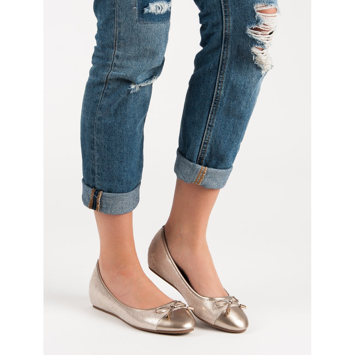 Ove balerinke odlikuju se suptilno sjajnom bojom koja kombinira nijanse zlatne i žute, što stvara spektakularan, upečatljiv naglasak na vašoj odjeći. Bez uzorka, ali sa zanimljivim ukrasima i šarmantnom mašnom, dodaju eleganciju svakom outfitu.