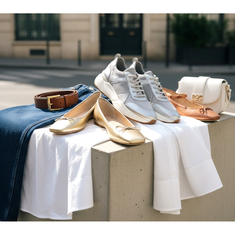 Probajte zlatne ravne cipele s tamnim traperom i jednostavnom bijelom košuljom. Dodajte kožni remen i minimalističku torbicu - učinak je iznenađujuće luksuzan, a istovremeno potpuno udoban. Srebrne balerinke savršeno nadopunjuju monokromatske stilove u sivoj i bijeloj boji.