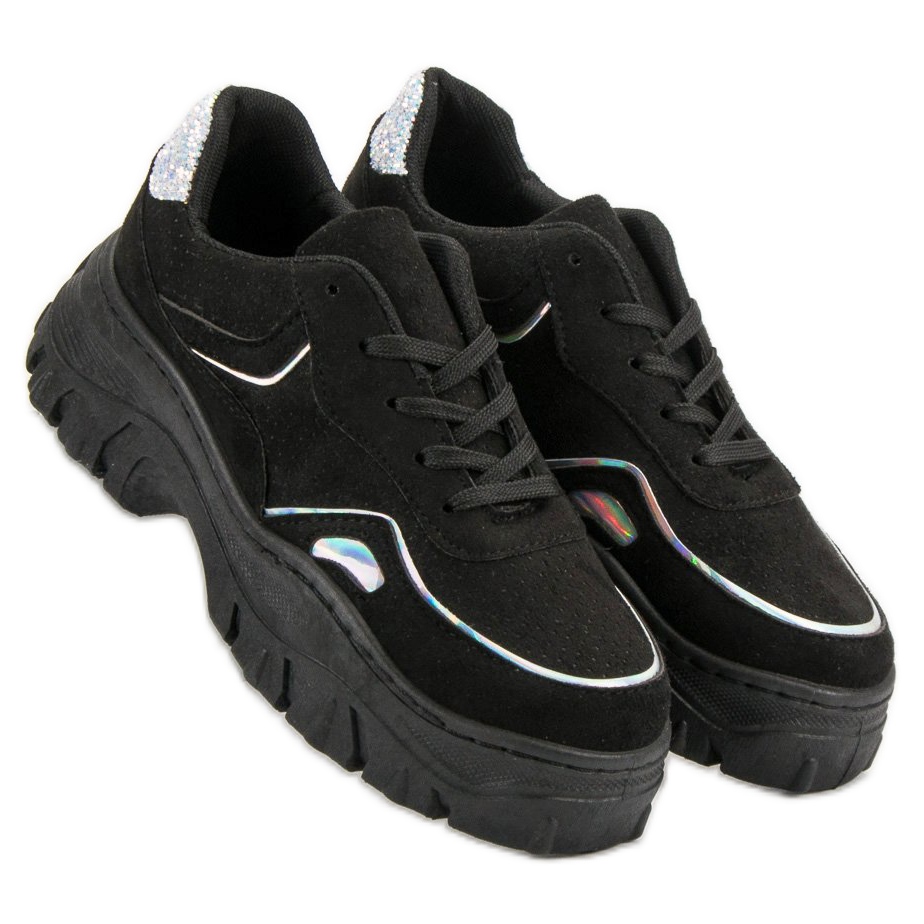 Srednje visoka platforma od 5 centimetara u živoj crnoj boji savršeno apsorbira udarce, osiguravajući udobnost tijekom dugih šetnji. Štoviše, nježno svjetlucanje i sjajni umetci daju im jedinstven karakter, čineći ih savršenim dodatkom svakom sportskom stajlingu.