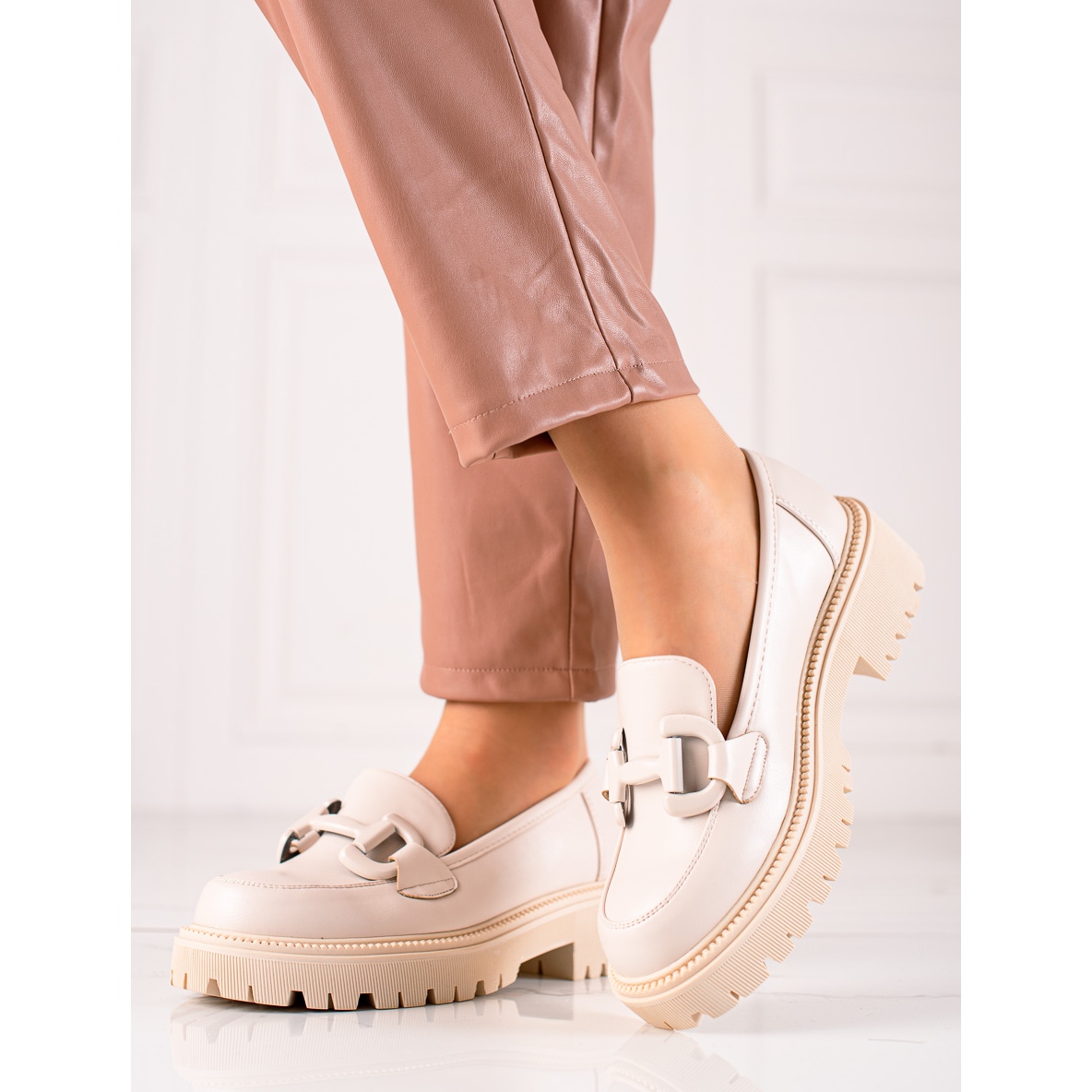 Mokasine su postavljene na platformu visine 2,5 cm i ravnu petu visine 4,5 cm, što povećava njihovu udobnost, a istovremeno optički izdužuje noge. Plastični potplat s gazištem osigurava dobro prianjanje na raznim podlogama, što ih čini savršenim za proljetne i ljetne dane.