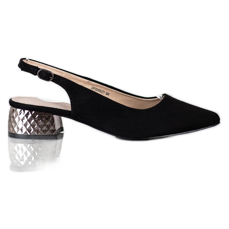 Cipele karakteriziraju zaobljeni vrh u obliku badema i otkrivena peta koja im daje lakoću i svježinu. Za stabilnost tu je praktičan remen s kopčom koji se pričvršćuje iznad pete. Srebrna potpetica visine 4,5 cm spaja eleganciju s udobnošću nošenja savršeno naglašavajući svaki stajling.