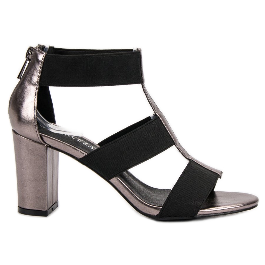 Moderne VINCEZA sandale na visoku petu u elegantnoj nijansi sive savršen su izbor za žene koje cijene stil i udobnost. Izrađene od visokokvalitetnog tekstilnog materijala i sjajne ekološke kože, ove sandale savršen su dodatak kako svakodnevnom tako i večernjem stilu. Stabilna peta od 8 cm čini hodanje i plesanje u ovim cipelama užitkom.