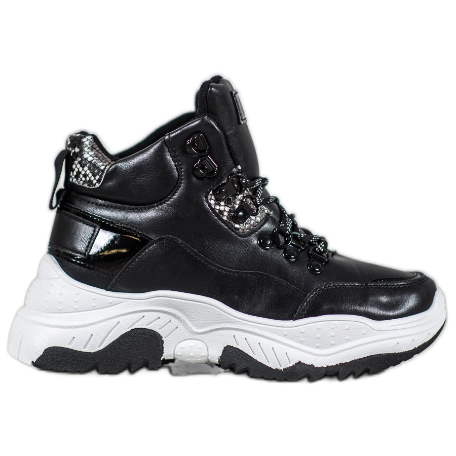 Spoj sportskog stila i malo elegancije savršena je kombinacija koju ćete pronaći u crnim Fashion tenisicama na vezanje Bella Paris. Ove unikatne ženske cipele karakteriziraju povišeni gornji dio, ukrašen umetcima s motivom zmijske kože, što im daje jedinstven karakter.