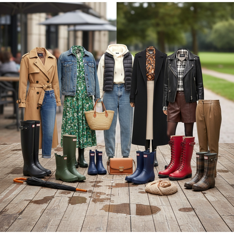 Urbani šik – klasične crne Hunter jakne u kombinaciji s pripijenim balonom, skinny trapericama i džemperom od kašmira. Dodajte kožnu torbicu i elegantan kišobran - spreman outfit za kišni dan u gradu.