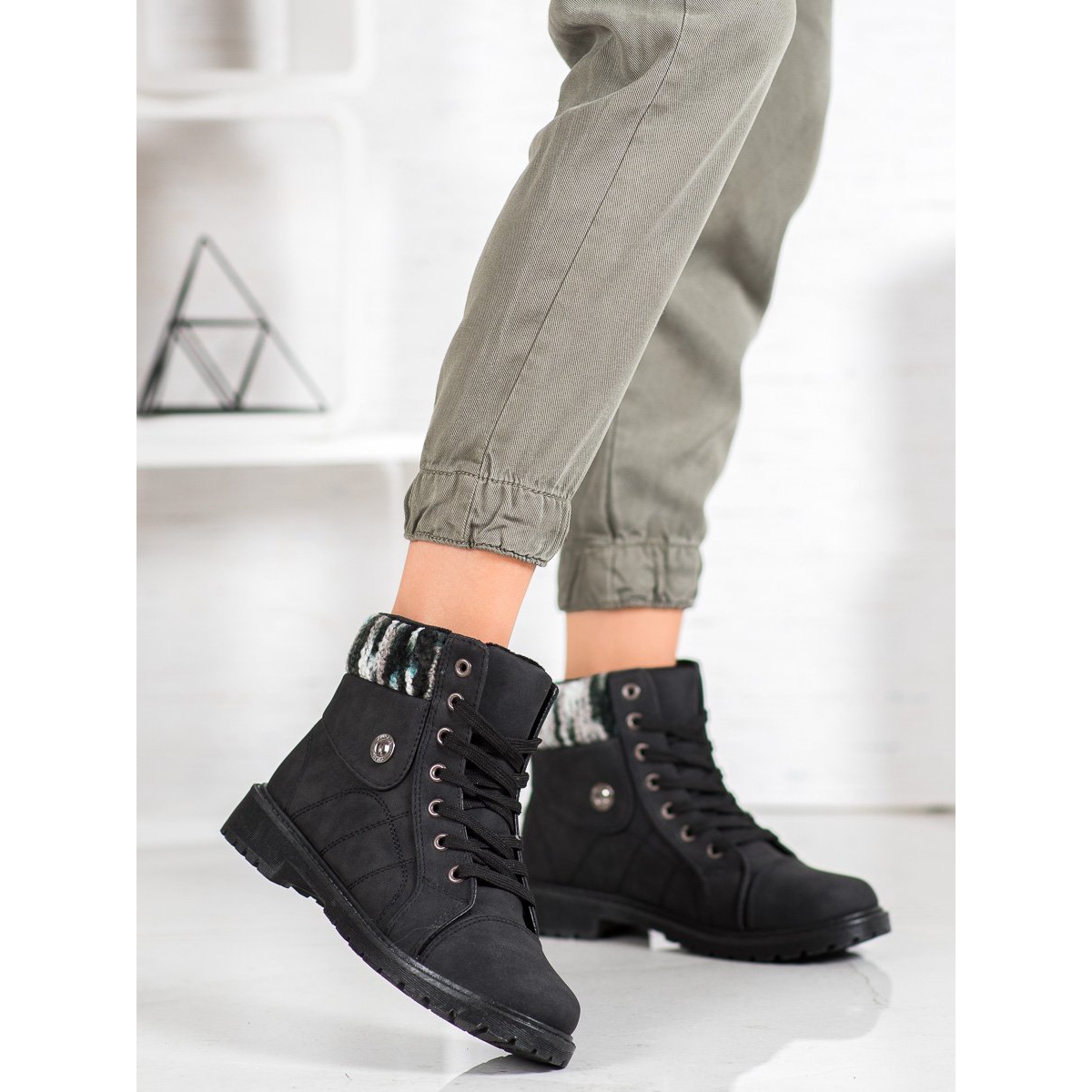 Trapper čizme sežu iznad gležnja što dodatno naglašava njihov moderan karakter. Njihovo vezivanje omogućuje savršeno pristajanje uz nogu, što osigurava stabilnost i udobnost tijekom svakodnevnih aktivnosti. Široka peta visoka 3 cm čini čak i duge šetnje užitkom.