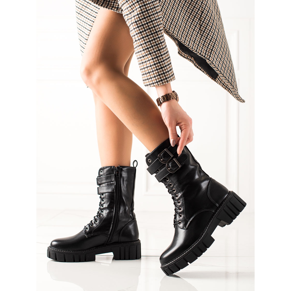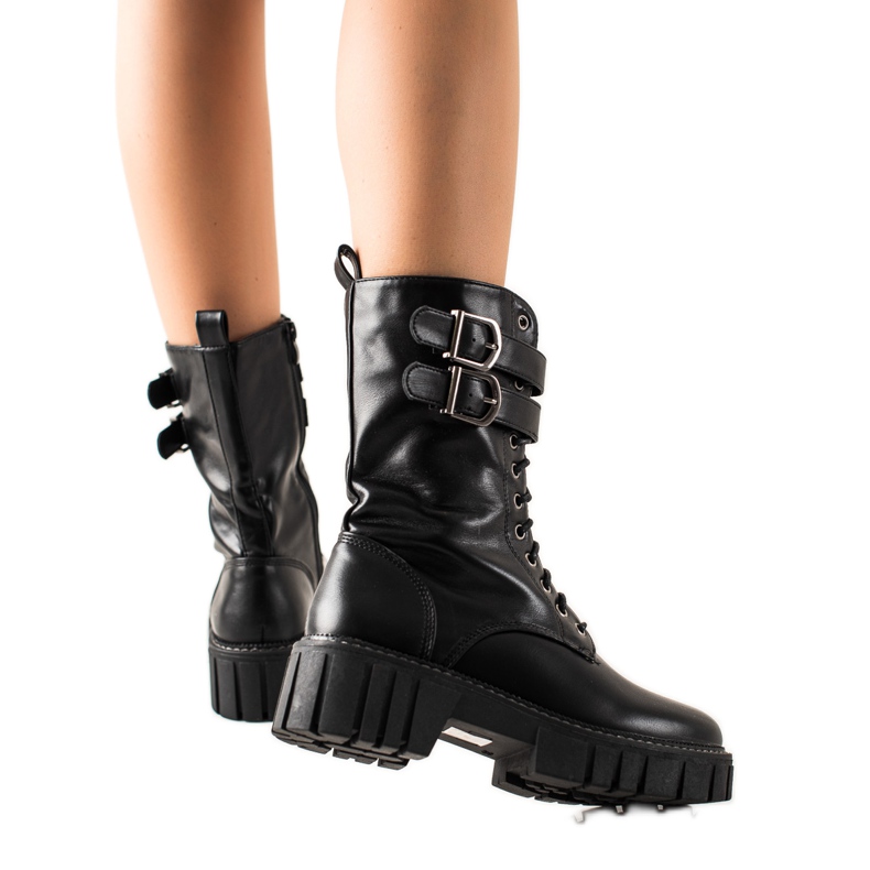 Crne radničke čizme odlikuje se ukrasnom kopčom koja im daje malo karaktera i čini ih atraktivnom dopunom svakom outfitu. Zahvaljujući visokom gornjem dijelu koji seže iznad gležnja i platformi visokoj 3 cm odličan su izbor za hladnije dane.