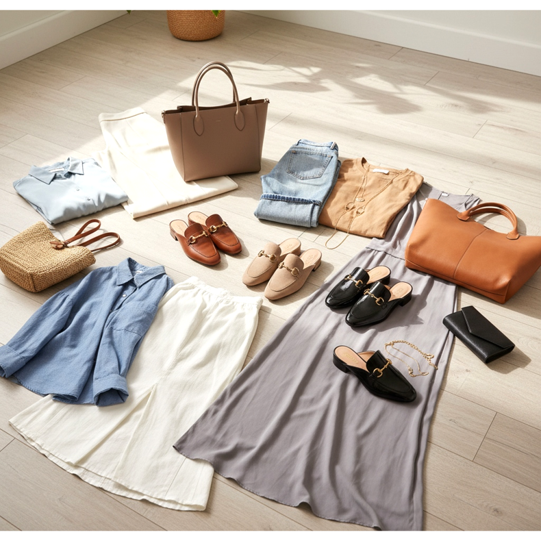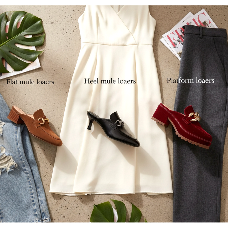 Uredski stil: Mule mokasina s ravnom ili niskom petom, u kombinaciji s hlačama sa širokim preponama ili midi kožnom suknjom. Top s pripijenom, ali ležernom bluzom u meringue ili pastelnim tonovima. Učinak: profesionalan i moderan, bez suvišnog formalizma.