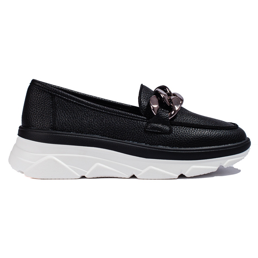 Klasični crni Vinceza Loafers kombinacija su bezvremenskog stila i svakodnevne udobnosti. Izrađene od ekološke kože s glatkim, elegantnim završetkom, izvrsni su i za ležerne setove i za formalnije prigode. Delikatni lanac na prednjoj strani dodaje karakter i moderan naglasak.