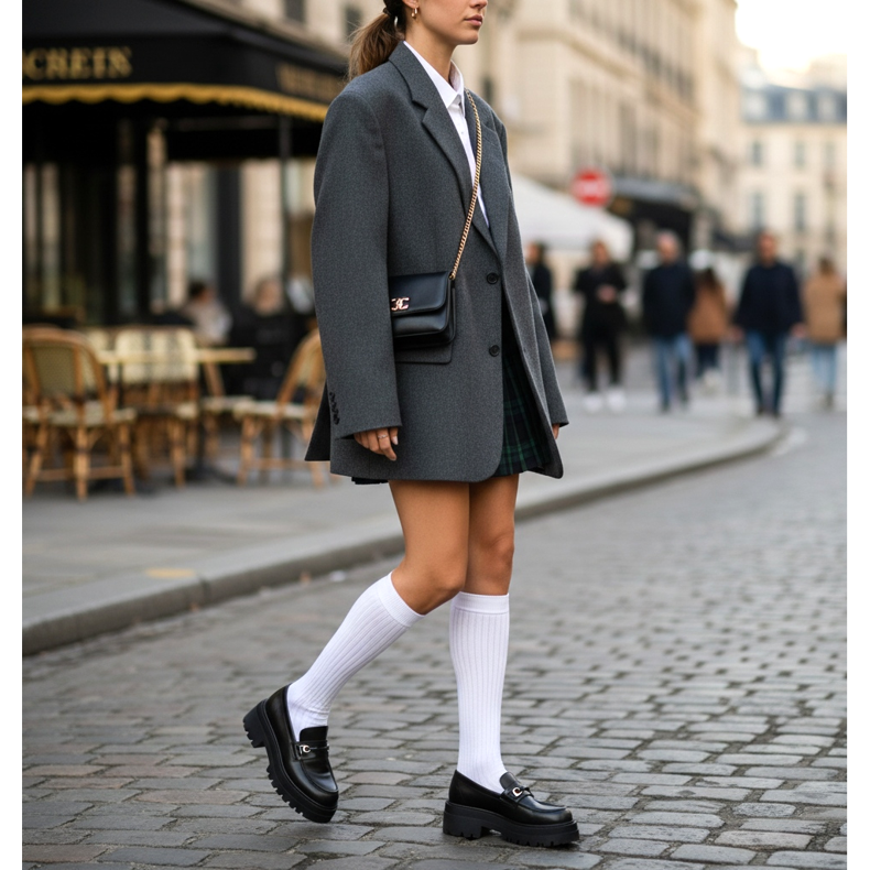 Najpopularnija i najmodernija kombinacija su mokasine s bijelim čarapama. Ovaj školski look s modernim štihom osvaja ulice modnih prijestolnica. Kombinirajte ih s kratkom kariranom suknjom i oversize jaknom za preppy izgled. Imajte na umu da bi čarape trebale biti besprijekorno bijele i lagano stršati iznad gornjeg dijela.