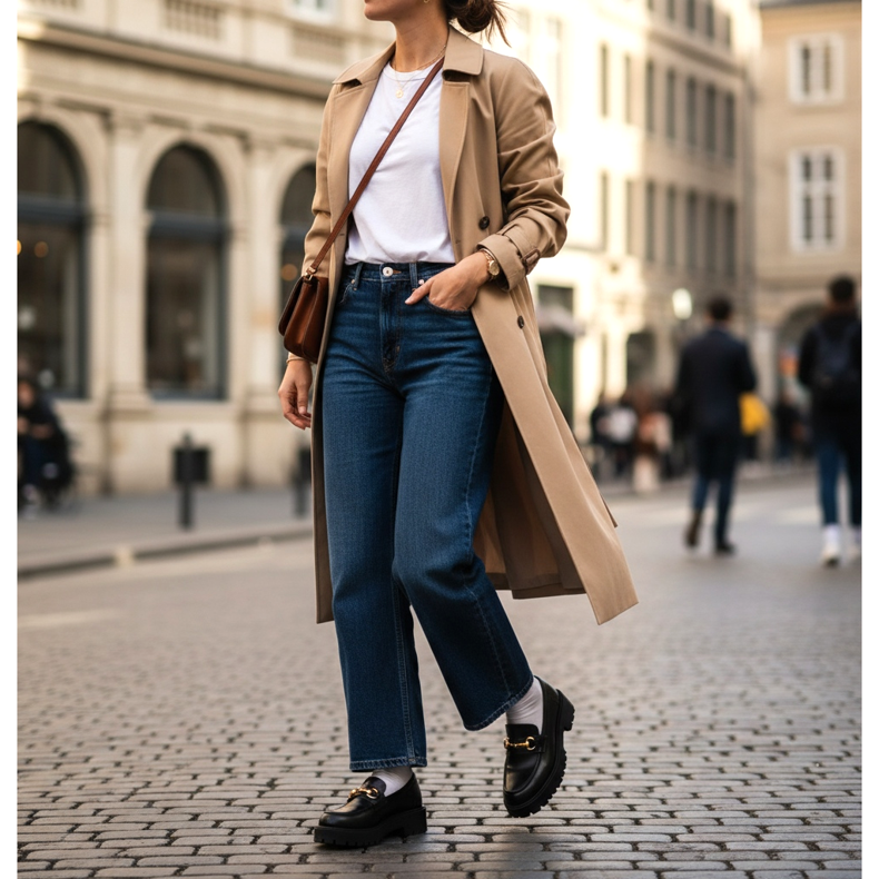 Zdepaste mokasinke također odlično stoje uz traperice. Najbolje će pristajati modeli ravnih ili širokih nogavica koji blago padaju na cipelu. Izbjegavajte uske traperice - u kombinaciji s tako velikim cipelama mogu narušiti proporcije vaše figure. Dodajte jednostavnu majicu i trenč i imate savršen svakodnevni outfit.