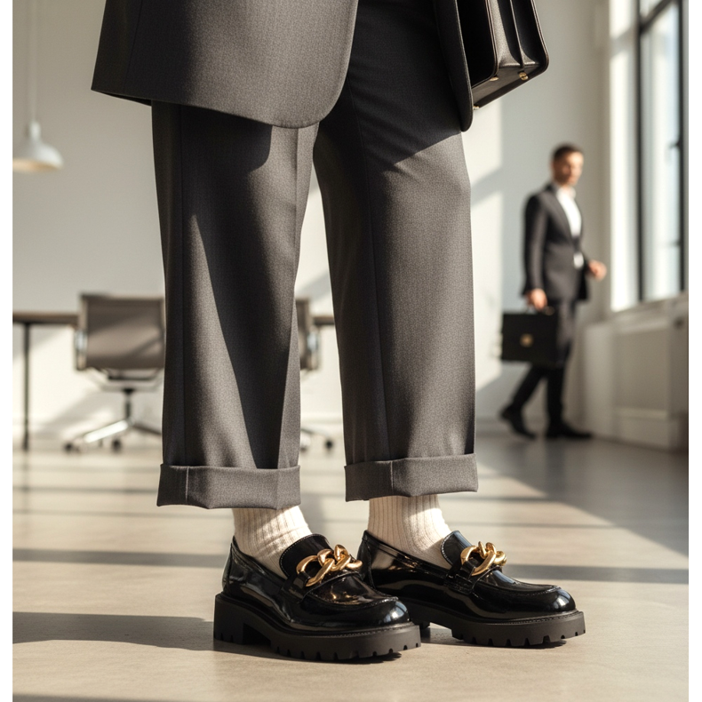 Ljubiteljicama elegancije preporučamo kombiniranje debeljuškastih loaferica uz odijela. Odaberite model sa zlatnom kopčom ili lancem kako biste stilu dodali karakter nakita. Ovaj komplet je udobna alternativa visokim potpeticama i dobro će pristajati u uredu (osim ako nemate vrlo stroga pravila odijevanja).
