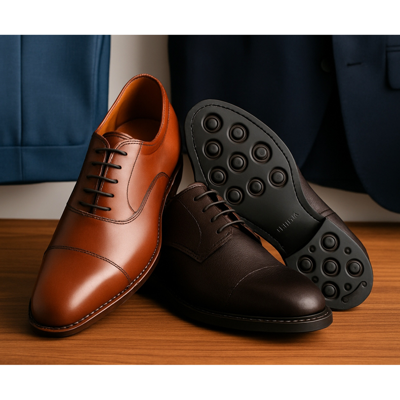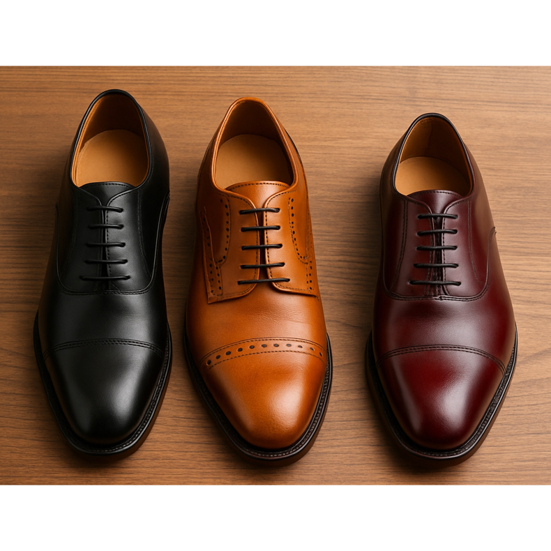 Crne ili tamno smeđe oksfordice, vrh ili običan vrh, zrnata koža, kožni potplat.