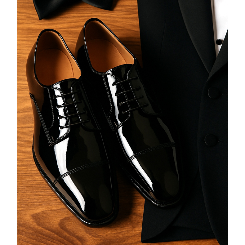Lakirane muške cipele (lakirana koža) su opcija rezervirana za white tie ili black tie dress code. Crne lakirane cipele pristaju samo uz smoking ili frak. Ne nosimo ih uz obično odijelo ili za tipično vjenčanje s poluformalnim ili koktel dress codeom. Ako pozivnica za vjenčanje jasno navodi vrlo formalni karakter (gala, crna kravata) - lakirane cipele bit će prikladne. U suprotnom, odaberite klasične mat oksfordice koje su svestranije i elegantnije, a da nisu pretjerane.