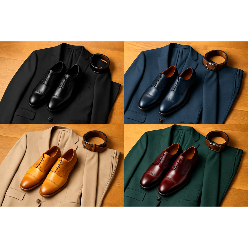 Osnovno pravilo: crne cipele pristaju uz crna, tamnoplava, ugljen i tamno siva odijela. Smeđe cipele (od svjetlosmeđe preko boje konjaka do tamnosmeđe) dobro se slažu s bež, svijetlosivim, plavim i zelenim odijelima. Nikada nemojte kombinirati crne cipele sa smeđim remenom ili smeđe cipele s crnim remenom – remen i cipele moraju biti iste boje. Bordo cipele (oxblood, bordo) univerzalna su alternativa - pristaju i uz tamna i svijetla odijela. Izbjegavajte svijetlosmeđe cipele za vrlo formalna vjenčanja.