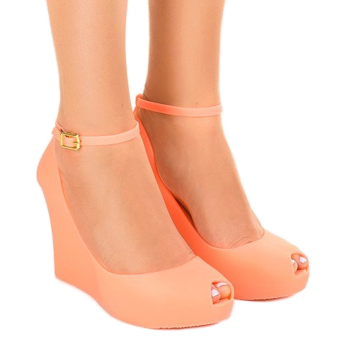 Cipele Meliski izrađene su od visokokvalitetne gume koja osigurava savršeno prianjanje uz nogu i udobnost nošenja. Otvoren vrh nogavica omogućuje sandalama da savršeno prozračuju stopala, a kopčanje na gležnju osigurava stabilnost. Zahvaljujući klinu visine 10 cm, ove cipele ne samo da optički izdužuju noge, već i daju samopouzdanje.
