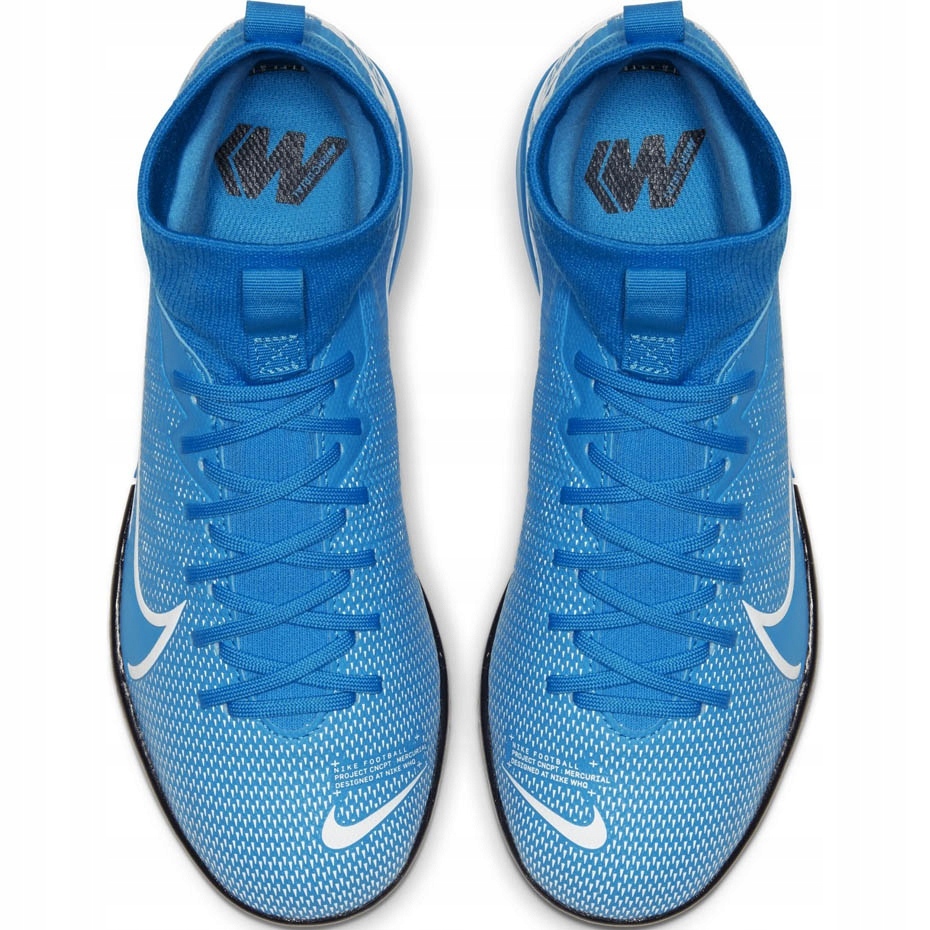 Nike Mercurial Superfly 7 Academy IC Junior AT8135 414 Nogometne cipele - Halls za mlade igrače koji žele igrati brzo i samouvjereno. Model iz kolekcije New Lights kombinira dinamični, plavo-bijeli dizajn s funkcionalnim otopinama poznatim iz linije Mercurial (ambasadori linije: Cristiano Ronaldo, Kylian Mbappé, Neymar).