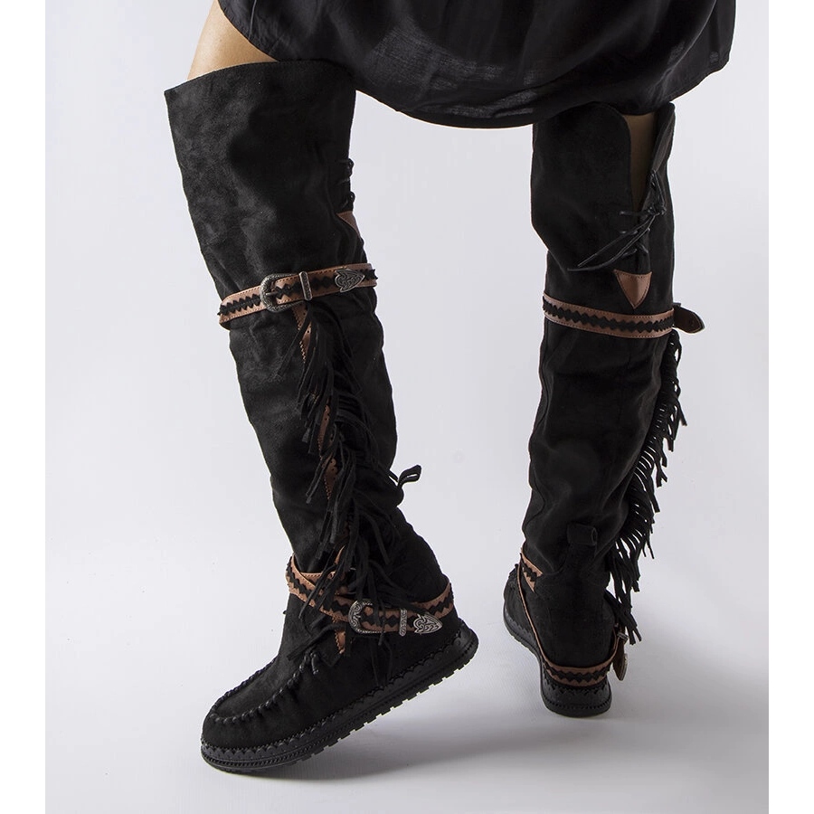 Elegantne, suprallanske novele čizme kombiniraju moderan dizajn s udobnošću nošenja. Izrađene od ekološke kože u klasičnoj crnoj boji, s suptilnim ukrasom u obliku ruba, oni su univerzalni element odjeće - idealan za haljine i suknje i ugrađene hlače.