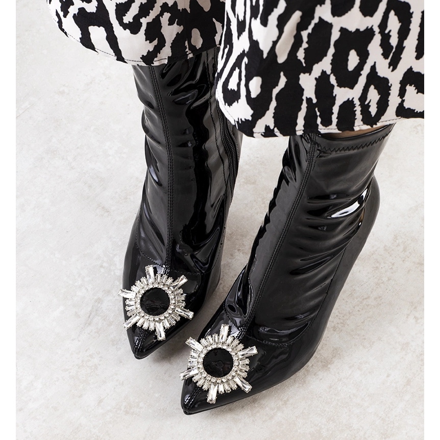 Fenomenalne čizme koje će odmah dodati vašu stilizaciju stilu i seksualnoj privlačnosti. Lakirana gornja dionica od visokokvalitetne ekološke kože lijepo odražava svjetlost, a vitak nos u Spitz i visok 10,5 cm, produžuje noge. Nježni ukras cirkona dodaje eleganciju i suptilan sjaj - savršen za večernje izlete i elegantne prigode.