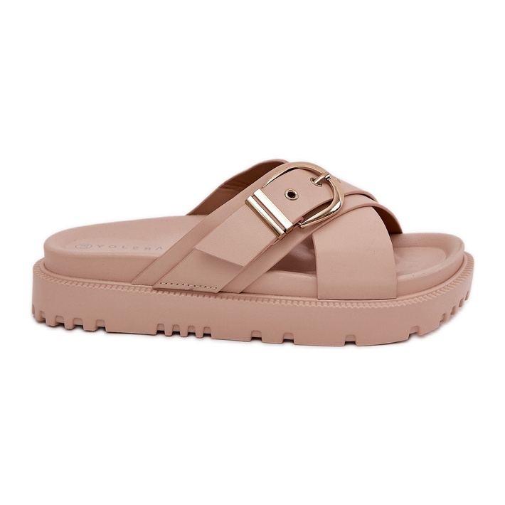 Otkrijte udobnost i stil za tople dane zahvaljujući zakrilcima na platformi s bež kopčama. Napravljeni od visokokvalitetne eko kože, ovi flip flops kombiniraju moderan dizajn s svakodnevnom funkcionalnošću. Prednja strana ukrašena je s dvije široke, prekrižene pruge koje cipelama daju karakterističan i moderan izgled. Velika kopča na pojasu upada u oči, dodajući poseban stil zakrilcima.