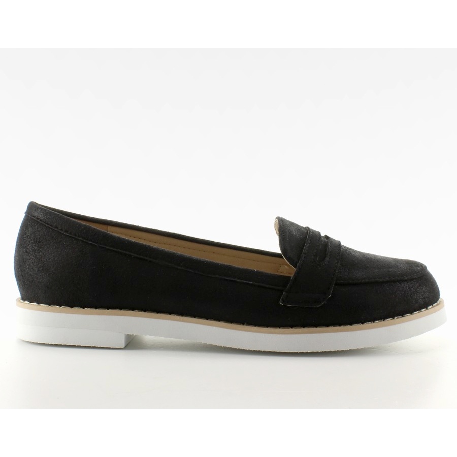 Pastelne ženske mokasine 7112 Black - crne sa suptilnim, prelijevajućim sjajem, spajaju klasični stil s laganim, modernim naglaskom. Oblikovani dizajn na bijelom, sportskom potplatu čini cipele svježim i elegantnim, a ujedno su savršene za svakodnevnu upotrebu.