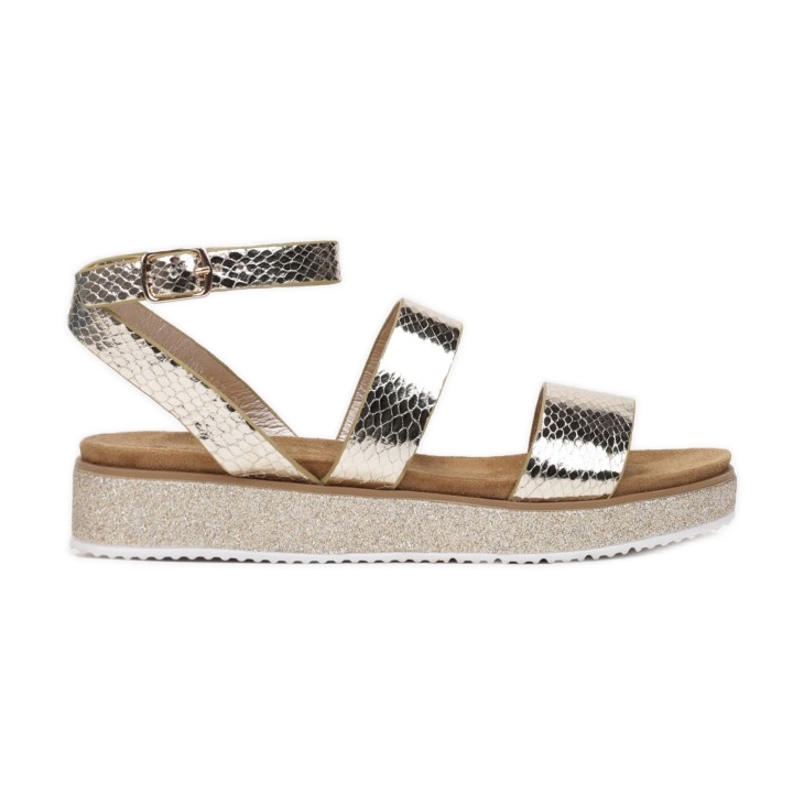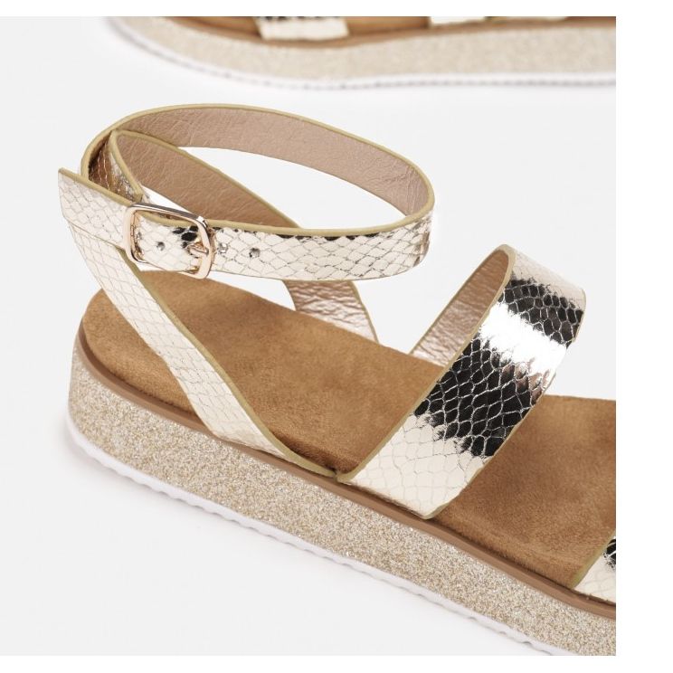 Sandale se odlikuju upadljivim svjetlucavim završetkom koji privlači pažnju i daje sjaj svakom stajlingu. Ukrasne pruge sa sjajem i reljefom daju im jedinstven karakter. Dodatno, udobnost nošenja osigurava kopča za gležanj, zahvaljujući kojoj sandale možete savršeno prilagoditi svom stopalu.