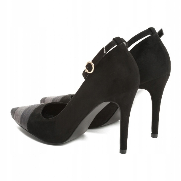 Crne salonke karakteriziraju izrazito zaobljeni, špicasti vrh i ugrađena peta, što im daje jedinstveni šarm. Tanak remen s kopčom ne samo da osigurava stabilnost, već i naglašava nježnost stopala. Valja istaknuti i dodatke u obliku sivih pruga na prstima koji cipelama daju jedinstven karakter.