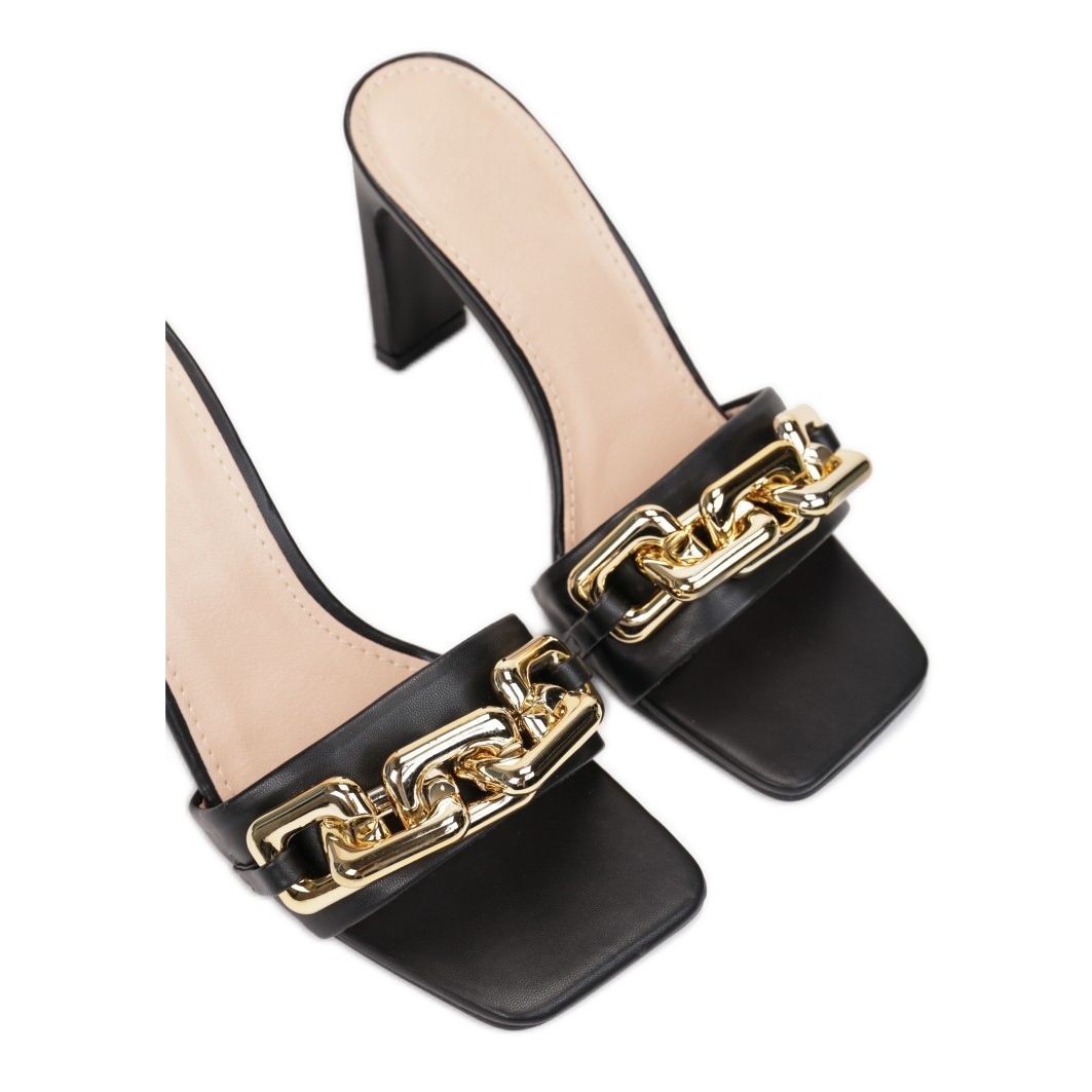 Predstavljamo Vices 1C-38 japanke na visoku petu u elegantnoj crnoj boji koje će zasigurno oduševiti svaku ljubiteljicu mode. Njihov klasični dizajn upotpunjen je modernim naglaskom - zlatnim lančićem koji ukrašava široki remen. Japanke imaju potpeticu od 9,5 cm, koja daje vitkiju siluetu i istovremeno osigurava udobno nošenje zahvaljujući slip-on dizajnu.