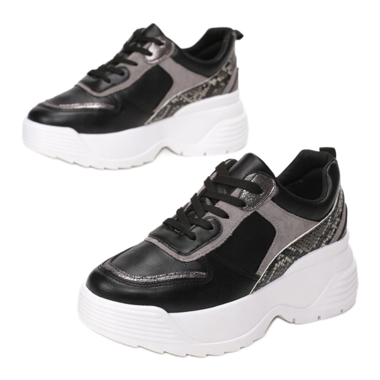 Ženske tenisice Vices 8541-38 u crnoj boji savršen su izbor za žene koje cijene stil i udobnost. Ove sportske cipele na vezanje odlikuju se modernim dizajnom zahvaljujući debelom potplatu s reljefom koji osigurava udobnost pri nošenju. Izrađene od visokokvalitetne eko kože i eko antilop kože, tenisice su ukrašene elegantnim šavovima i umetcima koji imitiraju zmijsku kožu, što im daje jedinstven karakter.