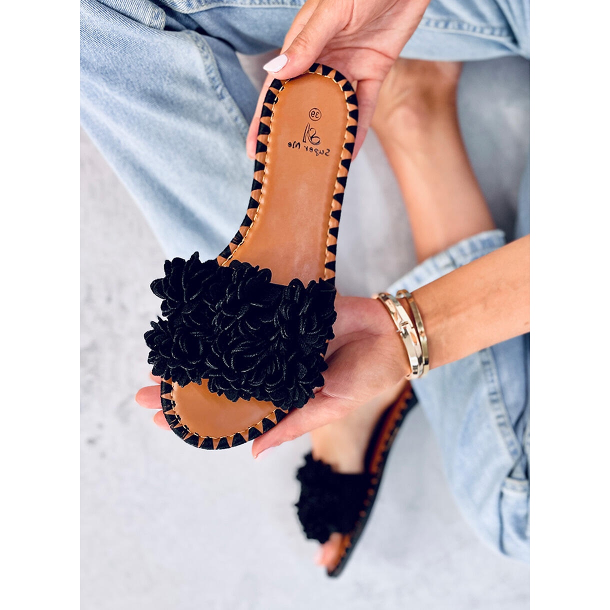 Izrađen od ekološkog antilopa, jamči ne samo užitak nošenja, već i svijest o odabiru ekološki prihvatljivog proizvoda. Crne japanke ukrašene su suptilnim, cvjetnim aplikacijama koje privlače pažnju i daju lakoću svakom stajlingu. Zahvaljujući tome mogu biti izvrstan naglasak na svakodnevnim outfitima, kako ležernim tako i pomalo elegantnim, ljetnim haljinama.