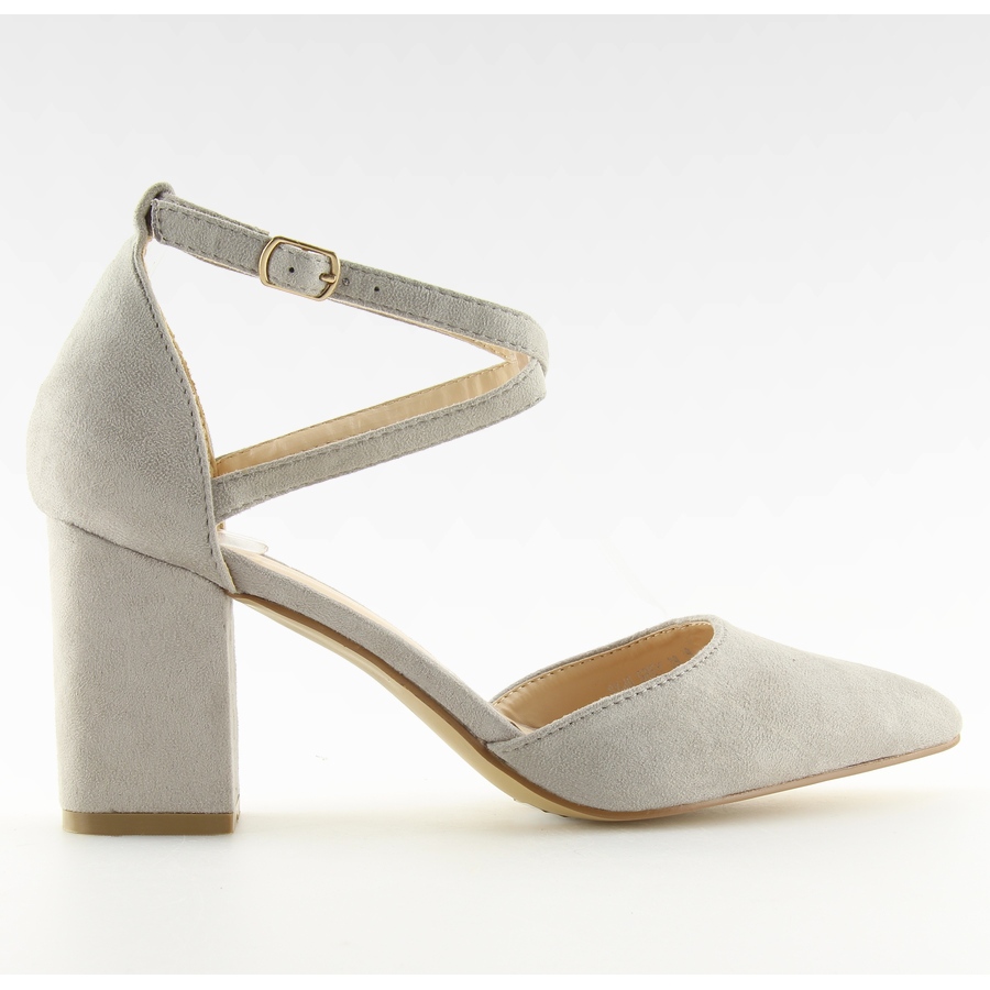 Klasične ženske salonke s izrezanim stranama i bademastim vrhom. Model je izrađen od eko antilopa u univerzalnoj sivoj boji, postavljen na stabilnu blok petu visine 8,5 cm - savršen spoj elegancije i udobnosti. Zakopčavanje kopčom dodaje suptilan karakter i poboljšava pristajanje uz nogu. Unatoč bezvremenskom dizajnu, predstavljeni predmet ima vidljivu prljavštinu na vrhu cipele (vidi sliku).