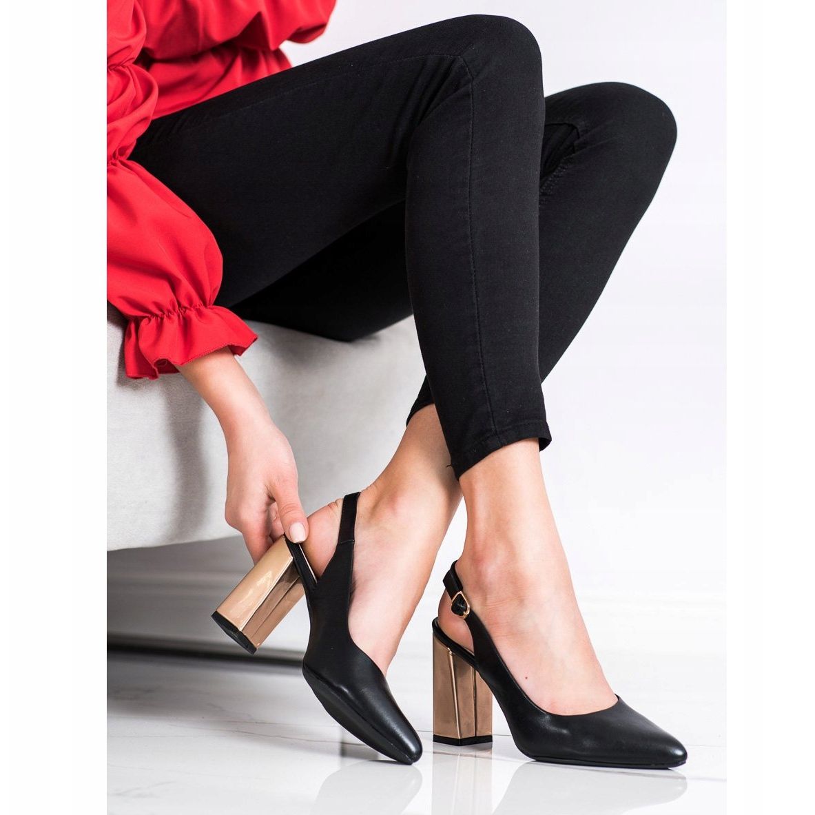 Visoka zlatna peta od 9,5 centimetara ne samo da daje eleganciju, već i optički izdužuje noge. Osim toga, kopča iznad gležnja praktičan je i moderan naglasak koji osigurava pravilno pristajanje. Cipele imaju gazisti potplat od plastike koji jamči udobnost i stabilnost pri hodu.