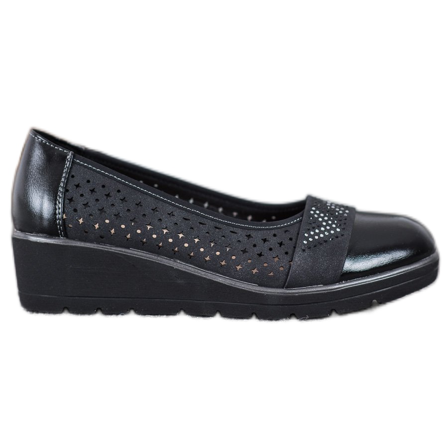 Gornji dio cipela izrađen je od imitacije kože, u kombinaciji s ažurnim uzorkom i ukrasnim kamenčićima, što im daje jedinstven karakter, savršeno usklađen s najnovijim trendovima. Zahvaljujući sintetičkom potplatu s gazištem, Comer pumpe jamče sigurnost i udobnost tijekom hodanja.