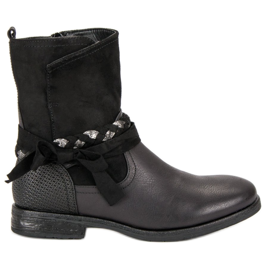 Crne radničke čizme odlikuju se neobičnim dizajnom koji spaja strogost sa ženstvenim šarmom. Zanimljiv ukras u visini gležnja, u obliku crno-srebrne tekstilne pletenice s trakom u obliku mašne, daje im originalan karakter. To ih čini savršenima za klasični i rock stil.