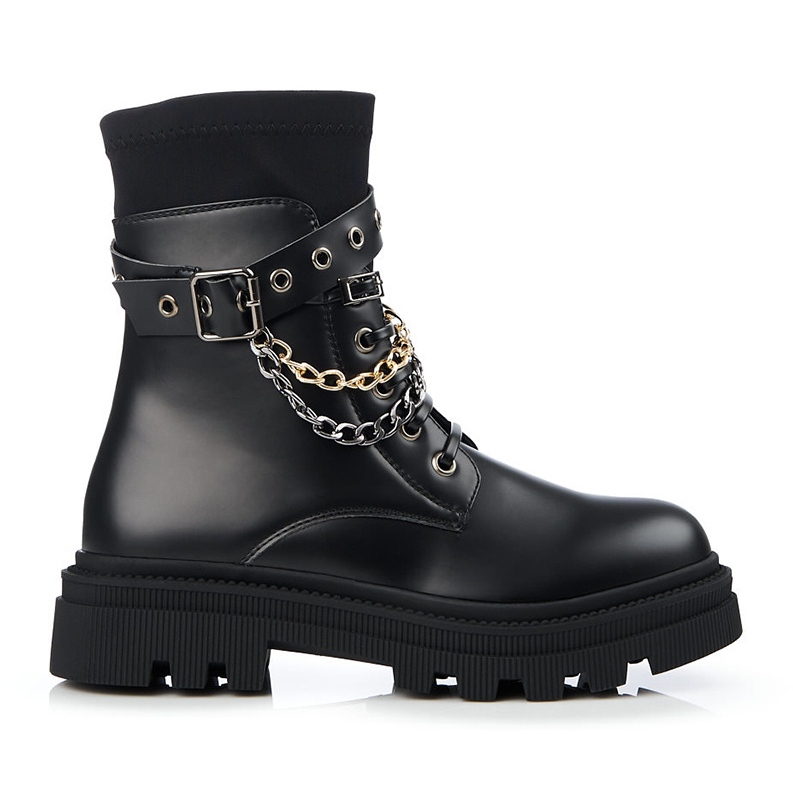 Predstavljamo unikatnu žensku obuću s lancima iz Sheloveta koja će oduševiti svaku ljubiteljicu moderne i udobne obuće. Izrađene od visokokvalitetne ekološke kože i tekstilnog materijala, ove crne gležnjače spajaju eleganciju i rock stil te savršeno pristaju uz casual, svakodnevni look.