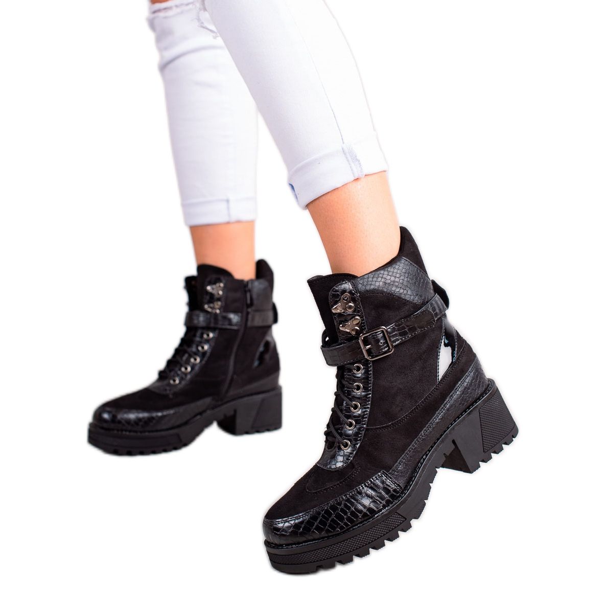 Ugrađena, mekana peta osigurava udobnost nošenja, a izolacija ih čini savršenim za hladne dane. Zahvaljujući 2,5 cm visokoj platformi i ravnoj peti (5 cm), ove gležnjače izuzetno su udobne za svakodnevno korištenje, kako u gradskoj vrevi, tako iu šetnji. Ležeran stil u kombinaciji s rock naglaskom dat će karakter svakom stajlingu.