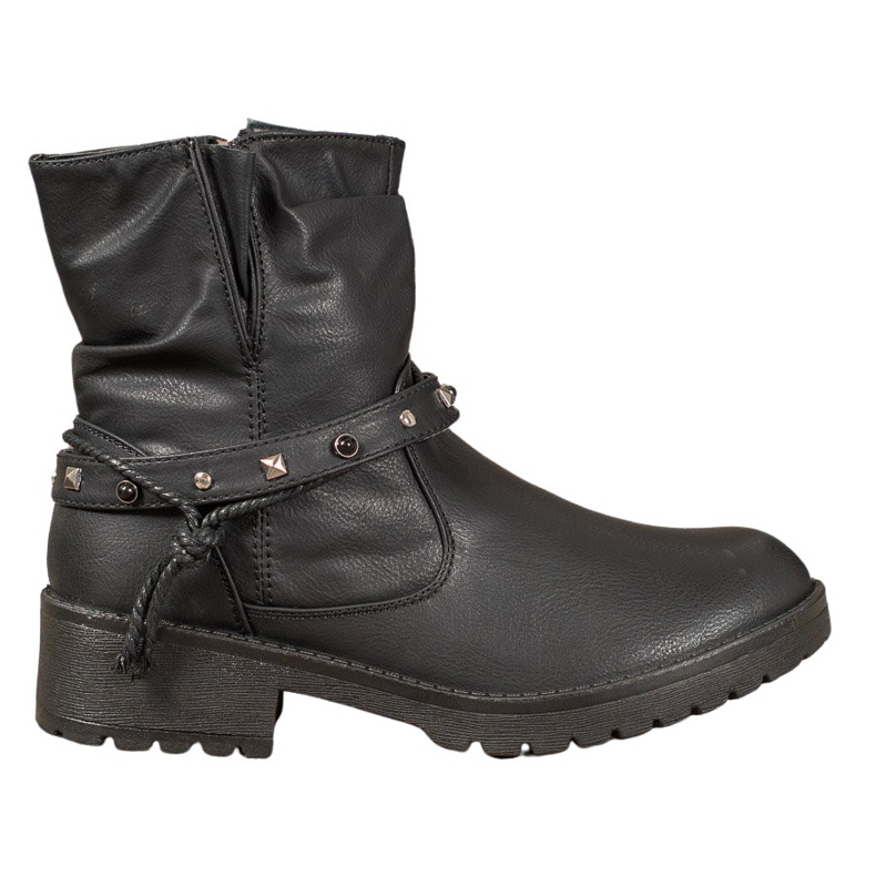Izrađene od ekološke kože, radnice se odlikuju čvrstom konstrukcijom. Svojim estetskim završetkom i ukrasnim remenom ukrašenim kamenčićima i perlicama ove cipele se ističu od ostalih modela. Ravna peta od 4 cm i platforma od 2 cm čine cipele ne samo modernim, već i udobnim. Patent zatvarač omogućuje brzo oblačenje i skidanje, a visoki gornji dio iznad gležnja dodatno naglašava njihov rock karakter.