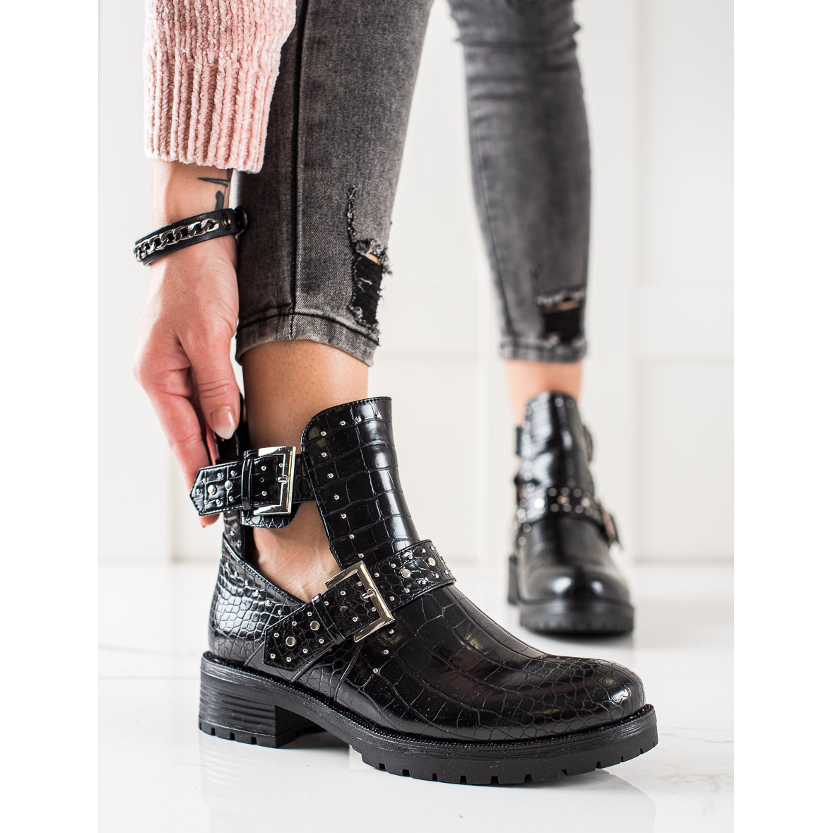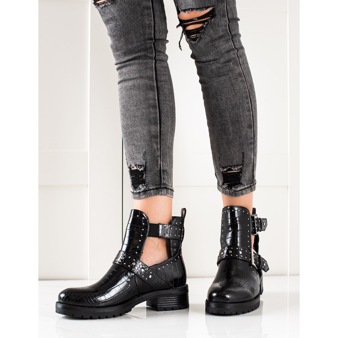 Bestelle radnice odlikuju se ukrasnom kopčom i suptilnim cirkonima koji im daju sjaj. Izrađene od ekološke kože, izgledaju elegantno, a njihov okrugli vrh naglašava ležeran stil. Gornjište visine 12 cm i širine 10 cm savršeno pristaje uz nogu, osiguravajući udobnost i slobodu kretanja.