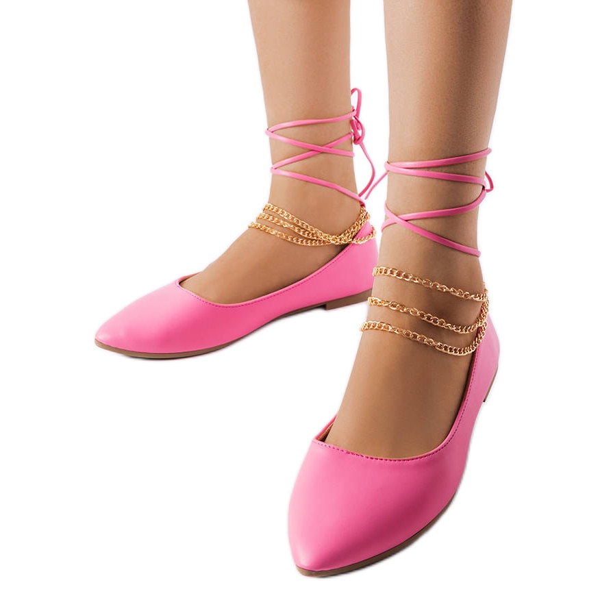 Donat ružičaste balerine su elegantne i praktične cipele savršene za ljetne dane. Slipljena struktura i ravna, šiljasta linija daju im moderan izgled, a istovremeno garantiraju udobnost tijekom dana. Dekorativni lanac u zlatnoj boji dodaje modni karakter, zahvaljujući koje su balerine izvrsne i za svakodnevne i za elegantne stilizacije.