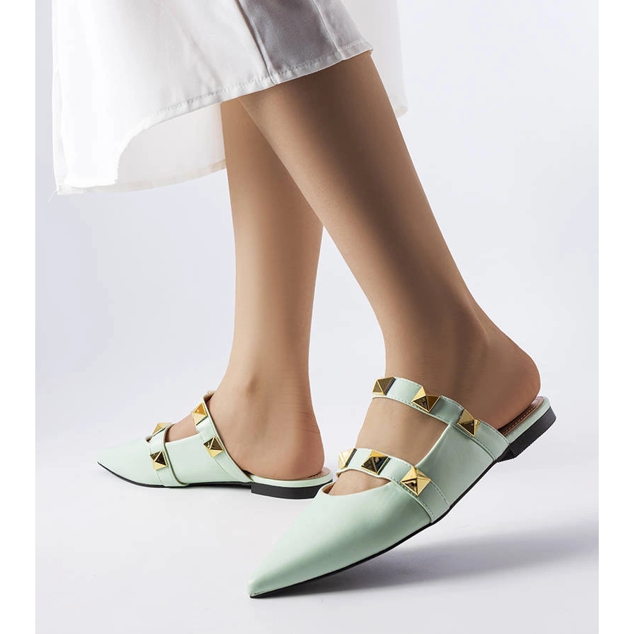 Elegantni, proklizavanje -u ruckmanu flip flip s izrazitim, šiljastim nosom. Izgrađena -u prednjoj i bočnoj strani, s izrezima na peti i metatarsusu, montiranim na ravni potplat (peta/platforma približno 1 cm, ukupna visina približno 2 cm). Ukrašeni s dvije pruge s metalnim klipovima u zlatnoj boji, koji stvaraju moderan, lagano stijenski karakter. Boja proizvođača: zelena; Crni potplat.