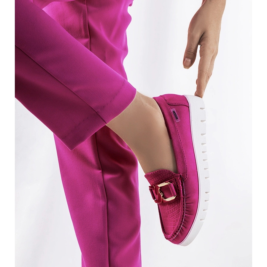 CAMPINI - Pink Loafers na platformi (Fuchsia) savršen je izbor za ljetne dane kada želite dodati stil svježine i ženskog karaktera. Suptilno pritiskanje u motivu krokodila i ukrasnog zlatnog lanca/kopče daju im elegantni, ali uz lako izgled. Umetak izrađen od prirodne kože pruža udobnost i dobro uklapanje tijekom dana, a bijeli gumeni potplat s platformom od 3 cm dodaje lakoću i modnu figuru.