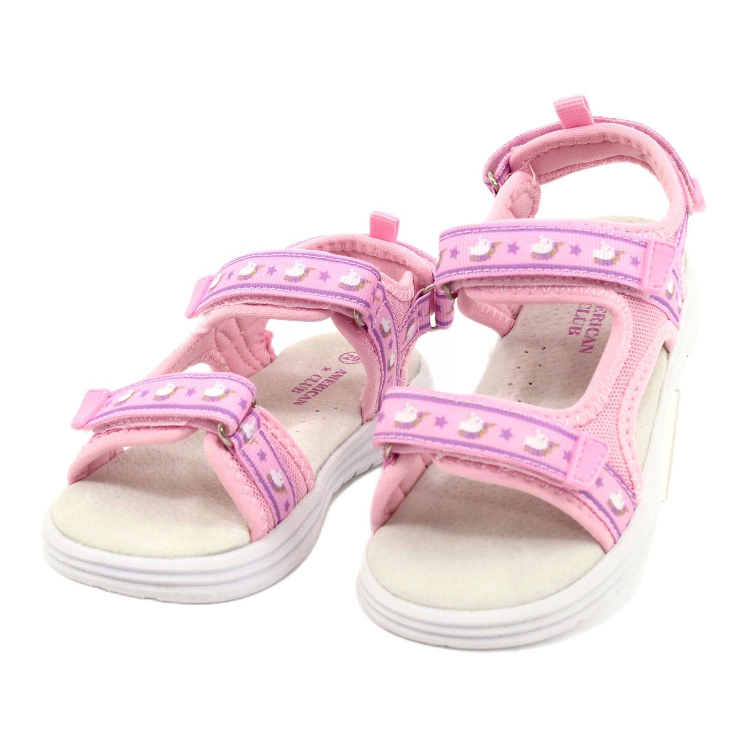 Pink sandala American Club RL39 - Šarmantna i udobna obuća za malo elegantke. Suptilna kombinacija ružičastih i ljubičastih i ukrasnih elemenata s motivom jednoroga na prugama učinit će da će svaki izlaz biti jedinstven. To je savršen izbor za djevojku koja se voli predstaviti modno.