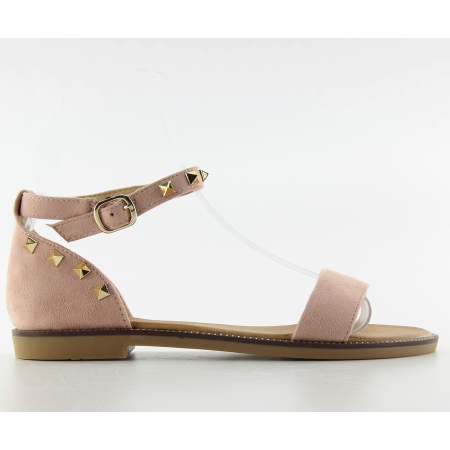 Nježne, ženstvene sandale s ravnim potplatom od mesnatog ekološkog antilopa. Jednostavan, širok remen na prstima i tanki remen oko gležnja ukrašen piramidalnim nitnama, kopča se kopčom. Lagani, plastični potplat (visine 1,5 cm) savršeno pristaje pod stopalo, naglašava figuru i osigurava udobnost nošenja.