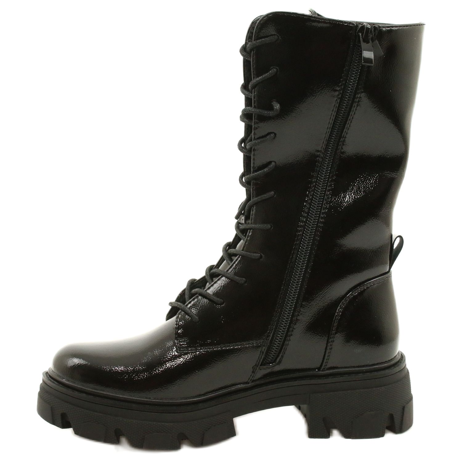 Elegantne, ženske čizme u modernom izdanju. Izrađena od lakirane ekološke kože, završena mekim, krznim umetkom i izolacijom u gornjem dijelu - savršena za hladnije dane. Klasično zatvoreno za čipke sprijeda i praktični bočni dvorac, što olakšava brzo stavljanje. Kombinacija kamenog karaktera s praktičnošću svakodnevne uporabe.