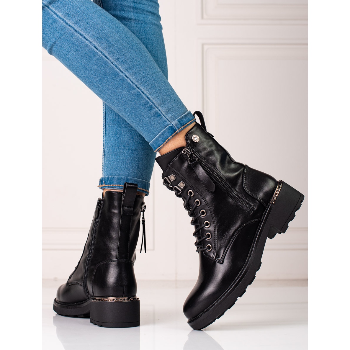 Otkrijte najnoviji trend obuće za sezonu jesen/zima uz Shelovet ženske čizme na vezanje u klasičnoj crnoj boji. Ove elegantne gležnjače izrađene su od visokokvalitetne ekološke kože, što ih čini ne samo modnim naglaskom, već i ekološki prihvatljivim izborom. Zahvaljujući ugrađenoj, ojačanoj peti, vaša stopala će se osjećati udobno i stabilno.